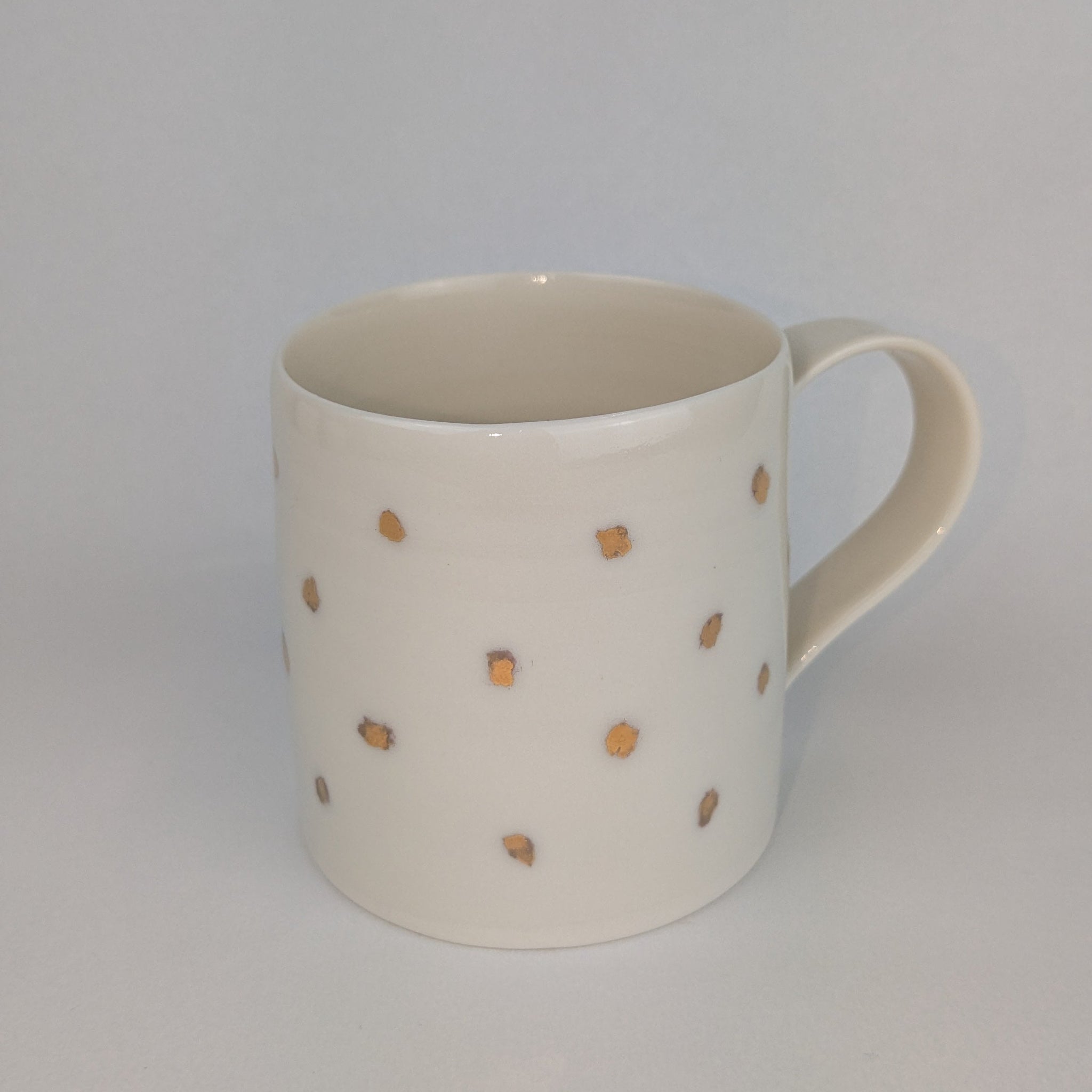 Hand thrown cup decorated with little unique scribbly spots painted with gold lustre.